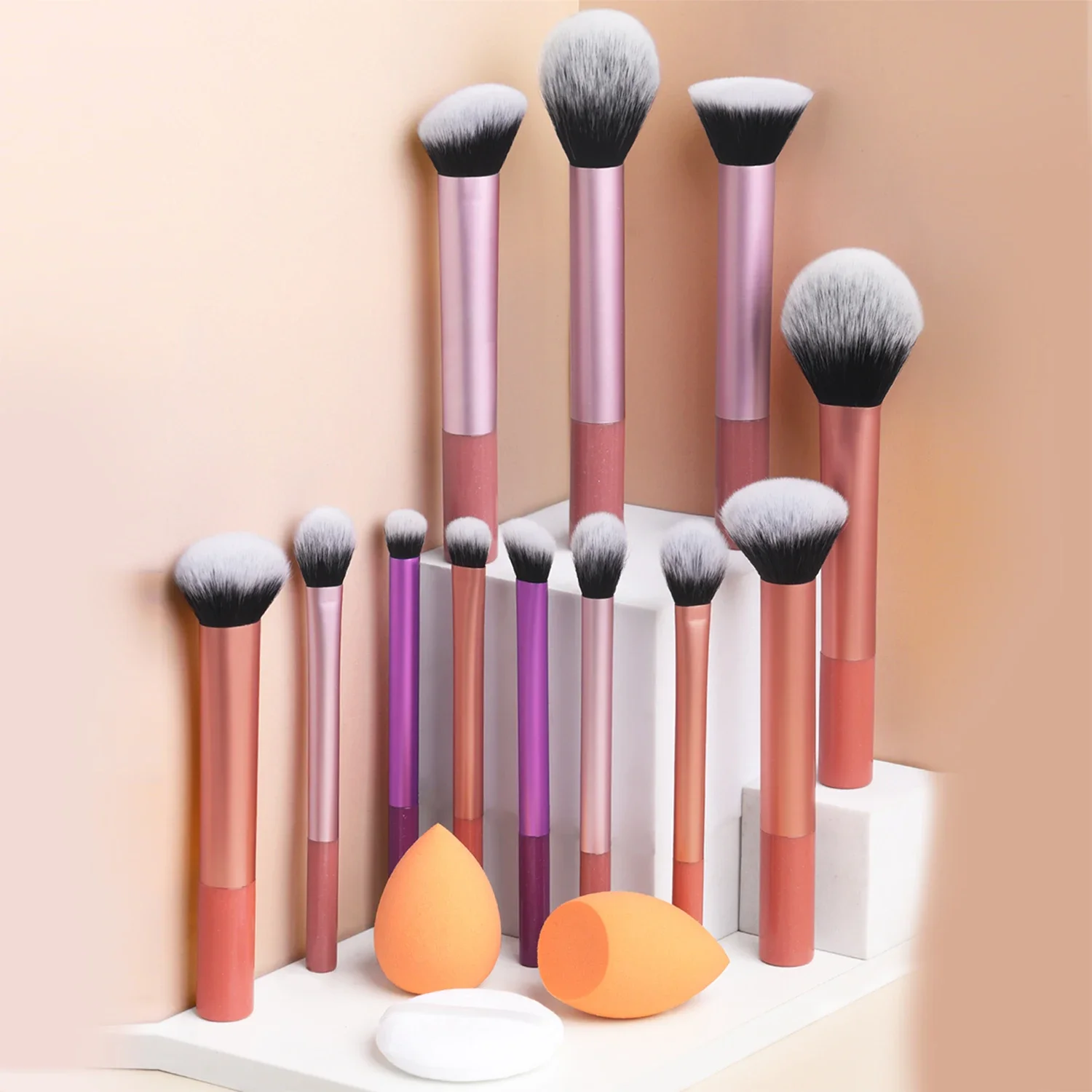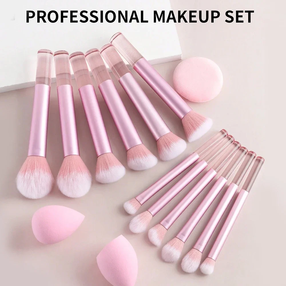12-Piece Professional Makeup Brush Set with Sponges & Powder Puff. A complete makeup essential kit featuring high-quality brushes for eyeshadow, powder, and blush application. Includes 12 premium brushes, 2 blending sponges,