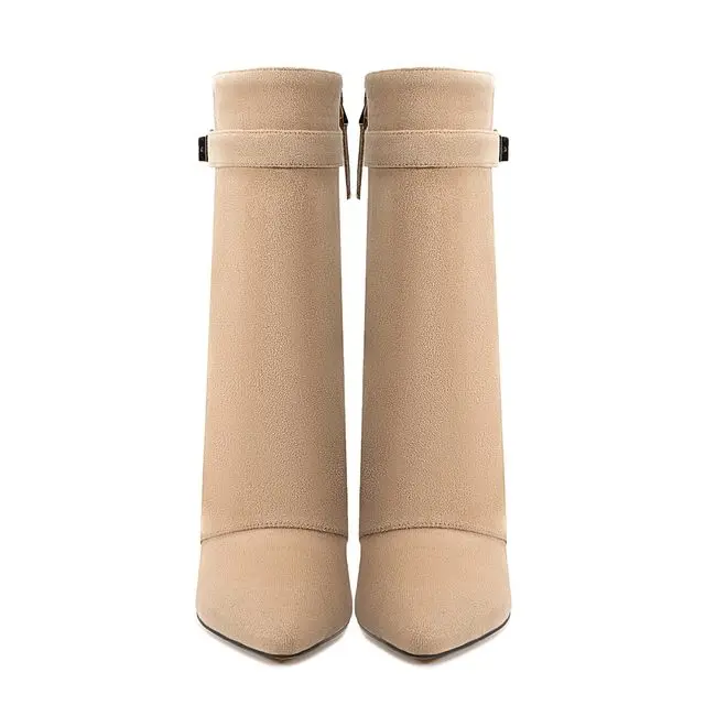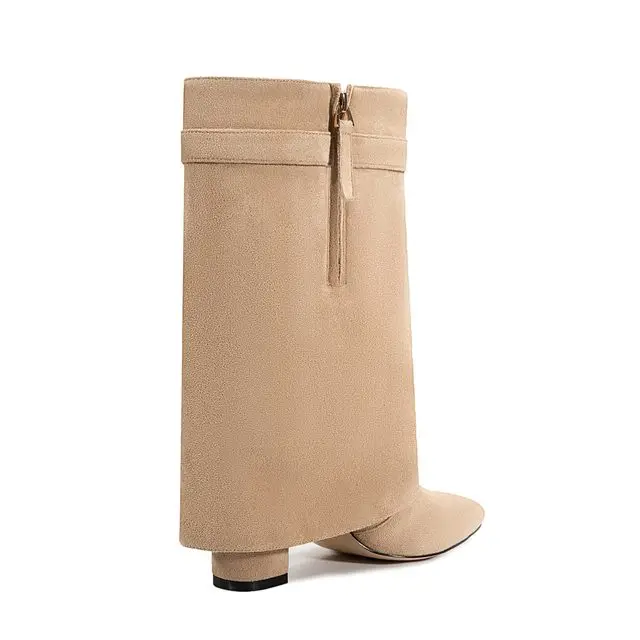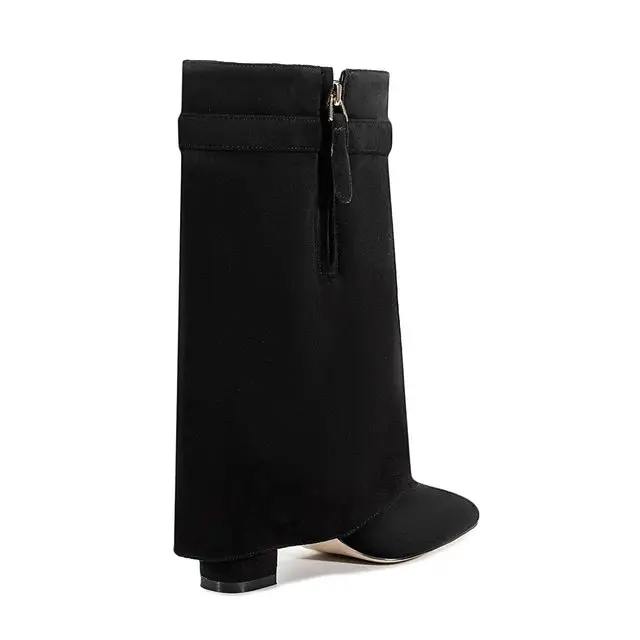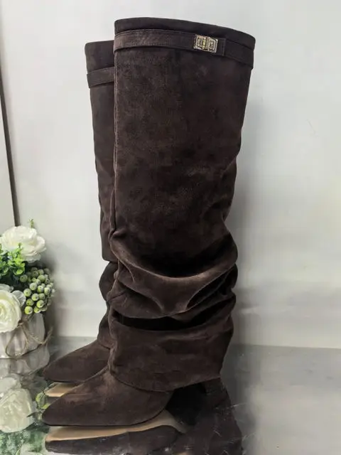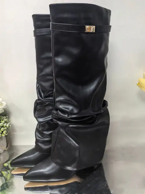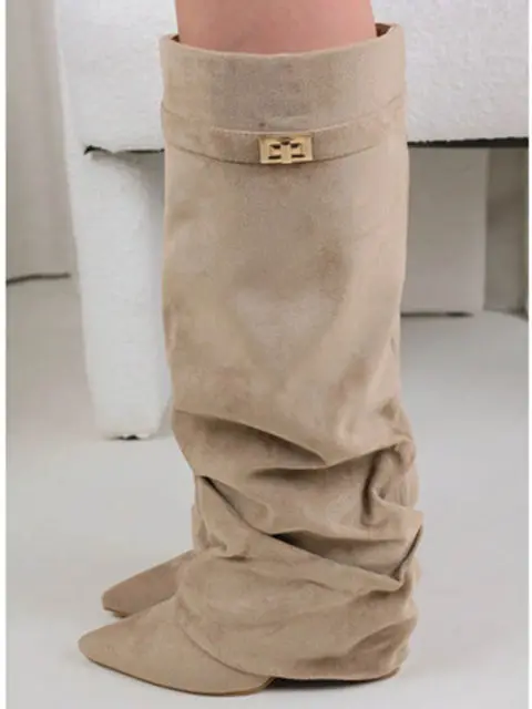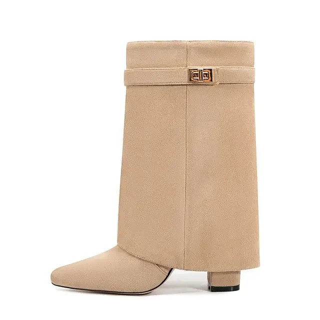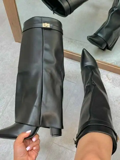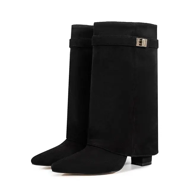 2025 Autumn/Winter Collection – Women’s Pointed-Toe Knee-High Boots with Metal Buckle. Featuring a thick high heel and sleek mid-leg design for a chic, fashionable look. Perfect for pairing with dresses or pants for elega